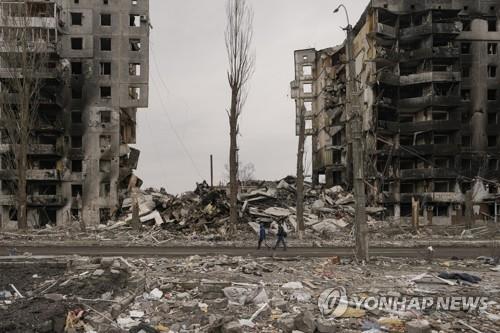 | ▲ 폐허로 변한 우크라 브로댠카 마을 폐허로 변한 우크라 브로댠카 마을 (브로댠카 AP=연합뉴스) 우크라이나 수도 키이우(키예프) 북서쪽 소도시인 브로댠카 주민들이 5일(현지시간) 러시아군 공격으로 파괴되고 벽면이 검게 그을린 아파트 앞을 걸어가고 있다. 2022.4.6 leekm@yna.co.kr |