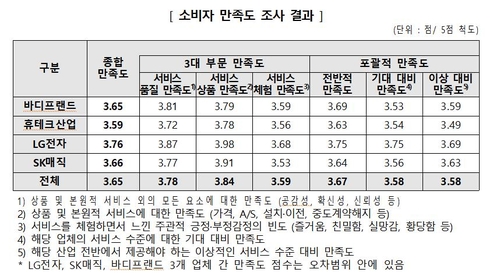 부문별로는 가격과 설치·이전 등 본원적 서비스에 대해 평가하는 '서비스 상품 만족도'가 3.84점으로 가장 높았다. 서비스 제공 과정 전반을 평가하는 '서비스 품질 만족도'는 3.78점, 서비스 체험의 긍정·부정 감정의 빈도를 묻는 '서비스 체험 만족도'는 3.59점이었다.