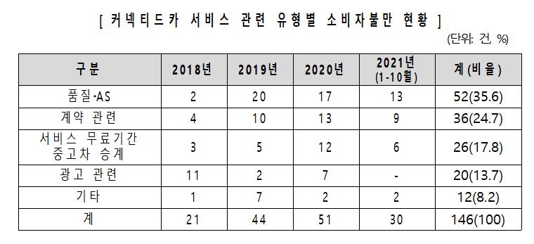| ▲ 커넥티드카 서비스 관련 유형별 소비자 불만 현황 [한국소비자원 제공. 재판매 및 DB 금지] |