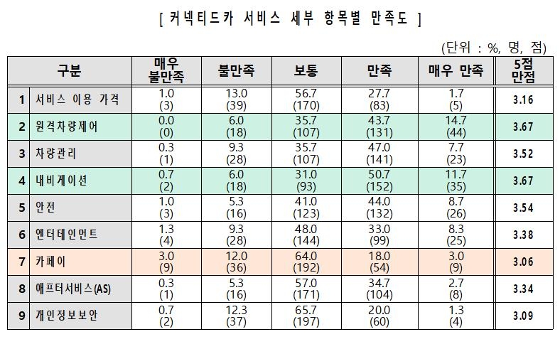 원격차량제어와 내비게이션에 대한 만족도는 각각 3.67점이었고 차에 탄 채로 실물 카드 없이 주문·결제가 가능한 '카페이' 만족도는 3.06점이었다.