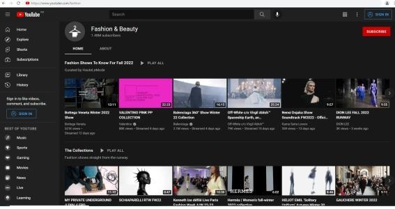 유튜브 패션은 세계 최대의 패션·스타일 콘텐츠 집합 채널로, 약 150만의 구독자를 보유하고 있다. 매년 전 세계 주요 패션위크 기간에 각종 패션쇼와 디자이너 등 소개 영상은 물론, 주최 도시(기관)에서 제작한 콘텐츠를 실시간으로 게시한다.