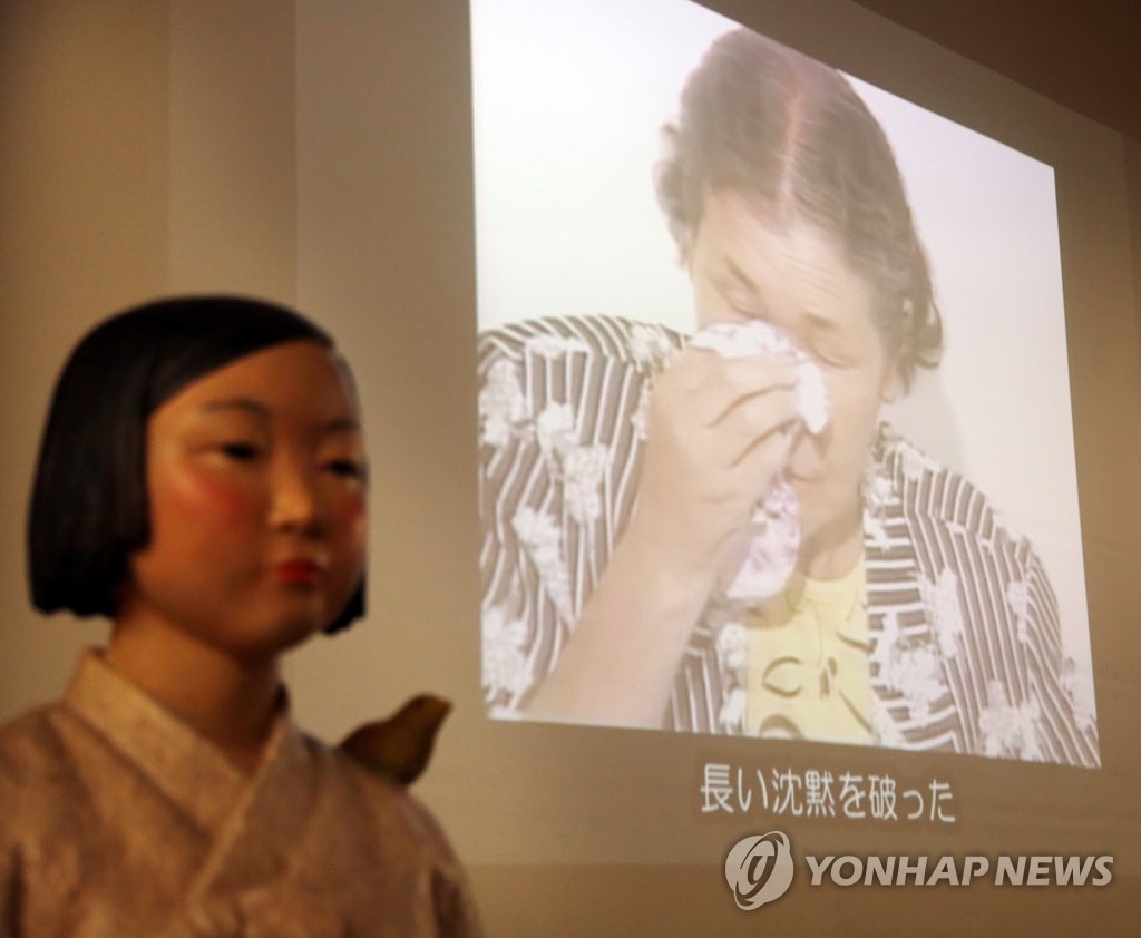 ▲ 위안부 문제 공개 증언한 김학순과 소녀상 (교토=연합뉴스) 이세원 특파원 = 2021년 7월 24일 일본 교토부(京都府) 교토시의 한 시설에 일본군 위안부 피해자를 상징하는 '평화의 소녀상'이 전시된 가운데 자신이 일본군 위안부 피해자라는 사실을 처음으로 공개 증언한 고 김학순(金學順·1924∼1997) 씨의 영상이 상영되고 있다.