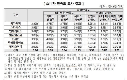 스타벅스의 종합만족도가 3.99점으로 가장 높았고 커피빈(3.93점)과 할리스커피(3.92점)도 평균을 웃돌았다.이어 이디야커피·투썸플레이스(각 3.83점), 메가커피(3.82점), 엔제리너스(3.69점) 등의 순으로 종합만족도가 높았다.