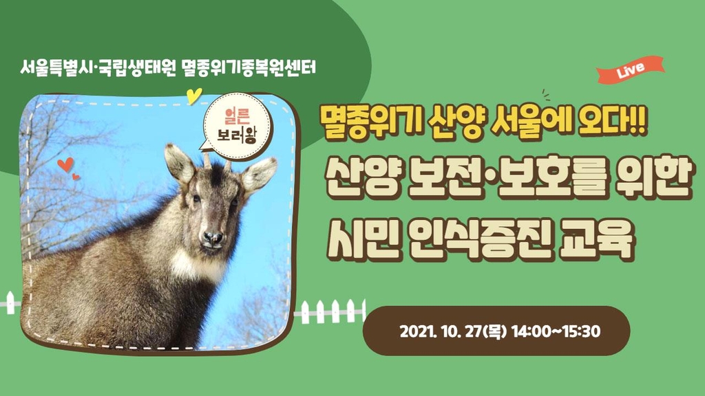 아울러 시는 산양 등 야생동물 보호를 위한 시민들의 인식을 높이고자 국립생태원과 함께 비대면 온라인 교육을 27일 오후 2시 진행한다고 밝혔다. '서울에 산양이 오다'라는 제목의 이번 교육은 화상회의 플랫폼 줌(ZOOM)과 '서울의 공원' 유튜브(youtu.be/iv1Nz_A4V9g) 채널로 동시에 이뤄진다. 관심 있는 시민은 누구나 참여할 수 있다.