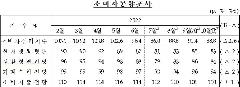 10월 전체 소비자심리지수(CCSI)는 88.8로, 9월(91.4)보다 2.6p 하락하면서 90 아래로 떨어졌다.