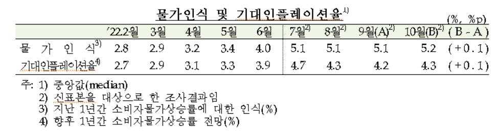 황희진 한은 통계조사팀장은 "소비자물가 상승률이 아직 5%대로 높은데다 10월 전기 및 가스 등 공공요금이 인상됐고 원유 감산 합의 소식도 있었다"면서 "미국 금리 및 환율 상승 등 대외요인도 심리적인 영향을 줘 기대인플레가 올랐다"고 분석했다.
