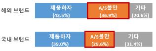 제품 하자 비중은 국내(39.0%)와 해외(42.5%) 브랜드 간 차이가 크지 않았지만, 서비스 관련 불만은 해외(36.9%)가 국내(29.6%)보다 상대적으로 높았다.