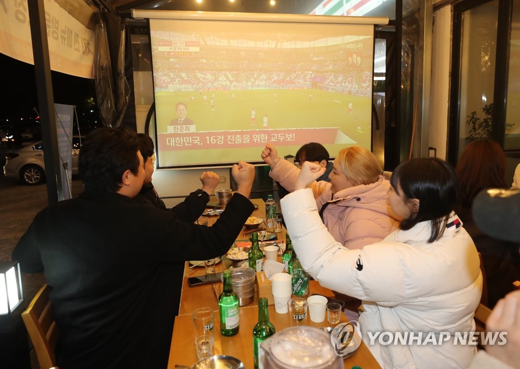 | ▲ 카타르 월드컵 '한국 화이팅' (대전=연합뉴스) 이주형 기자 = 대한민국 축구대표팀의 2022 카타르 월드컵 조별리그 첫 경기 우루과이전이 열린 24일 오후 대전시민들이 대전 서구 갈마동 한 치킨집에서 경기를 중계를 기다리며 국가대표팀을 응원하고 있다. 2022.11.24 coolee@yna.co.kr |