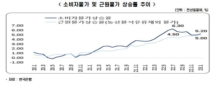 | ▲ 소비자물가 및 근원물가 상승률 추이 [한경연 제공. 재판매 및 DB 금지] |