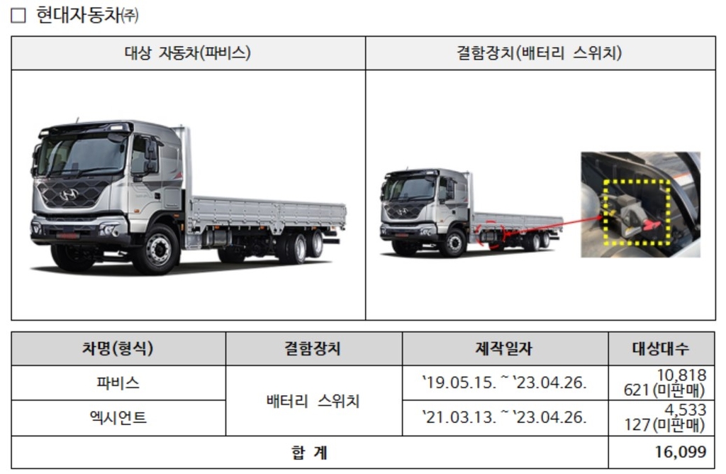 현대차에서 제작·판매한 트럭 파비스 등 2개 차종 1만6천99대(판매이전 포함)는 배터리 스위치 설계 오류로 스위치와 스위치 고정 구조물 사이에 이물질이 쌓여 전류가 흐르고, 화재로 이어질 가능성이 발견됐다.