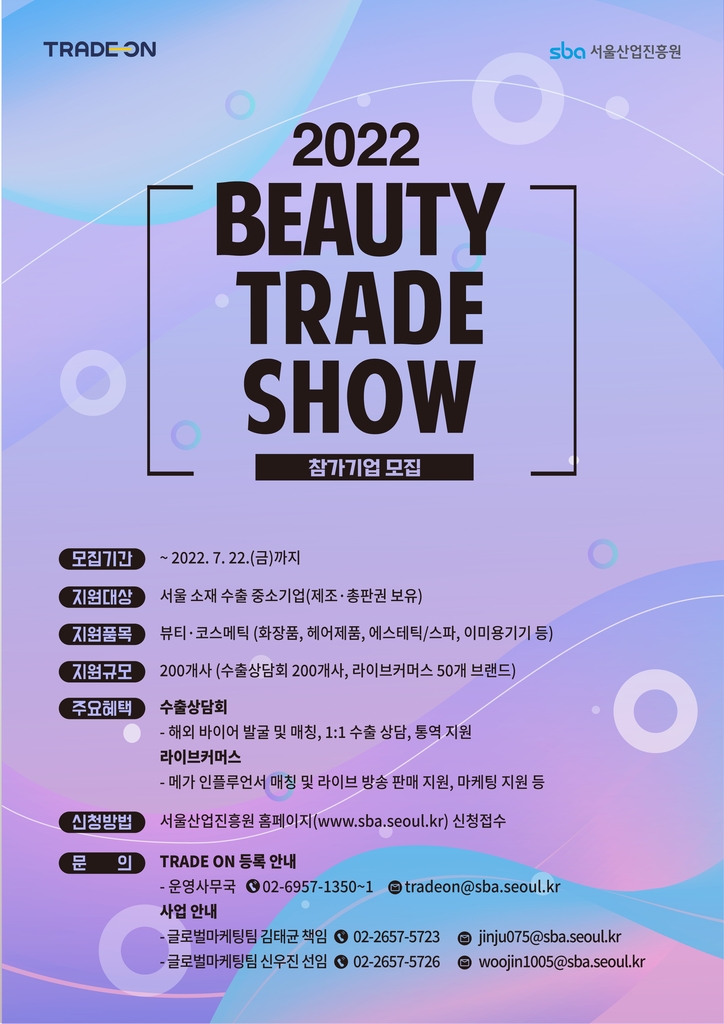 서울산업진흥원(SBA)은 10월 동대문디자인플라자(DDP)에서 '2022 뷰티 트레이드 쇼(Beauty Trade Show)'를 개최한다고 6일 밝혔다.