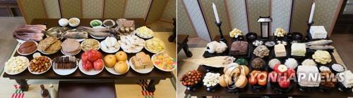| ▲ 남북 추석 차례상 비교해 보니 2018년 9월 17일 서울 중구 한국의집에서 한국문화재 재단 주최로 열린 '어서와 추석 애(愛) 한국의집은 처음이지'에서 북한 함경도·강원도식 차례상(왼쪽)과 서울서민식 차례상이 함께 전시돼 있다. 2018.9.17 [연합뉴스 자료사진] |