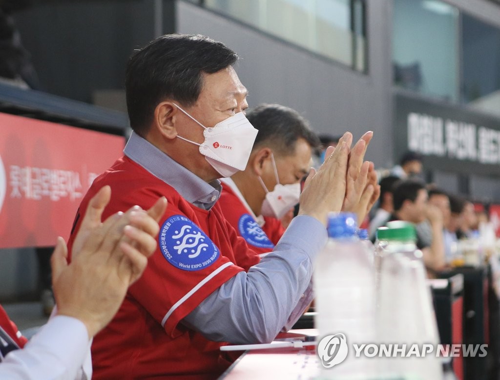 | ▲ 부산엑스포 유치 행사 참석한 롯데 신동빈 회장 (서울=연합뉴스) 신동빈 롯데 회장이 지난 7월 13일 부산 사직야구장에서 열린 부산엑스포 유치기원 행사에 참여한 모습 [롯데 제공. 재판매 및 DB금지] photo@yna.co.kr |