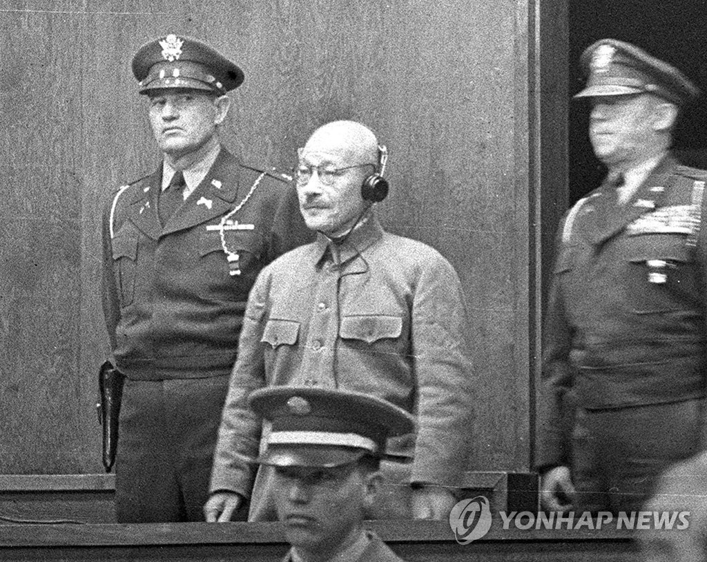 | ▲ 도쿄재판서 판결 듣는 도조 히데키 (교도=연합뉴스) 1948년 11월 12일 일본 도쿄에서 열린 극동군사재판(도쿄재판)에서 도조 히데키(東條英機) 전 일본 총리가 판결이 선고되는 것을 듣고 있다.[자료사진] |
