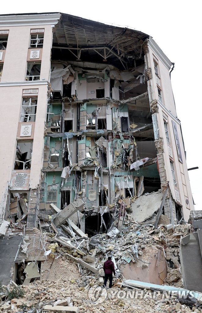 | ▲ 공습으로 무너진 키이우 호텔 (키이우[우크라이나]=연합뉴스) 류영석 기자 = 2023년 1월 4일 오후(현지시간) 우크라이나 키이우 시내의 한 호텔이 지난 31일 러시아의 공습으로 무너져 있다. |