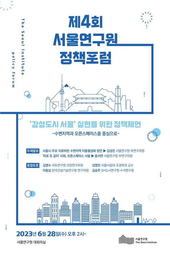 연구원의 김성은, 윤서연 부연구위원이 각각 '서울시 주요 지류하천 수변지역 이용활성화 방안', '따로 또 같이 사회, 열린공간(오픈스페이스) 서울'이란 내용으로 주제 발표를 한다.