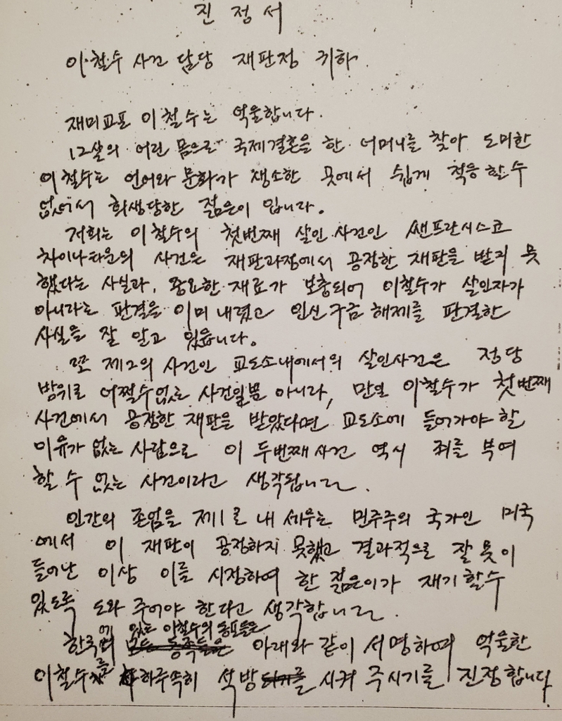 | ▲ 이철수 구명운동 과정에서 작성한 탄원서 한글판 초안 사본 [이문우 제공, 재판매 및 DB 금지] |