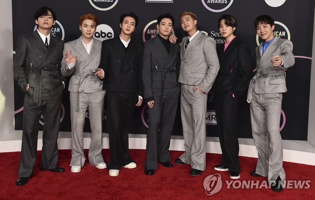 | ▲ AMA 시상식 참석하는 BTS…3개 부문 후보 (로스앤젤레스 AP/인비전=연합뉴스) 그룹 방탄소년단(BTS)이 21일(현지시간) 미국 캘리포니아주 로스앤젤레스 마이크로소프트 시어터에서 열리는 '아메리칸 뮤직 어워즈'(American Music Awards·AMA)에 도착해 포즈를 취하고 있다. 방탄소년단은 대상에 해당하는 '아티스트 오브 더 이어'(Artist of the Year)를 비롯해 '페이보릿 듀오 오어 그룹'(Favorite Duo or Group)과 '페이보릿 팝송'(Favorite Pop Song) 등 총 3개 부문 후보에 이름이 올라 있다. 2021.11.22 knhknh@yna.co.kr |