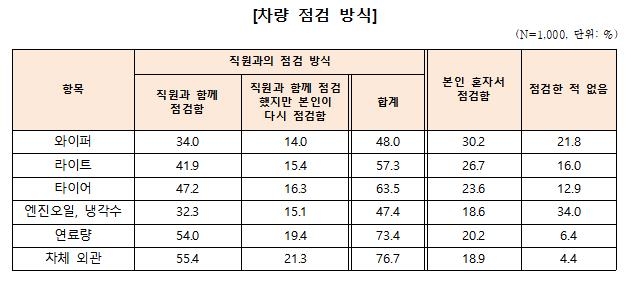 엔진오일은 안전과 직결되고, 와이퍼와 라이트는 고장률이 높은데도 차체 외관이나 연료량보다 직원과 함께 점검한 비율이 낮아 개선할 필요가 있다고 소비자원은 지적했다.