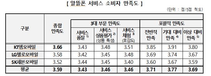 사업자별로는 KT엠모바일이 3.66점으로 가장 높았다. 이어 LG헬로모바일(3.58점), SK세븐모바일(3.52점) 순이었다.
