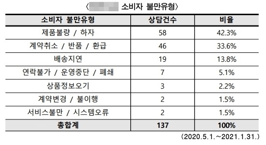 서울시 전자상거래센터에 따르면 지난해 5월부터 올해 1월까지 B사 플랫폼 공식몰 관련 소비자불만 상담은 137건에 달했다. 이 중 42.3%에 달하는 58건이 제품 불량과 관련된 상담이었다.