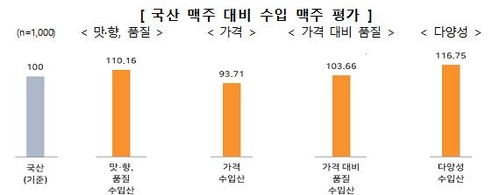 국산 맥주(100 기준)와 비교해 수입 맥주의 맛과 향, 품질은 평균 110.16, 다양성은 116.75로 더 우수한 것으로 평가했다.