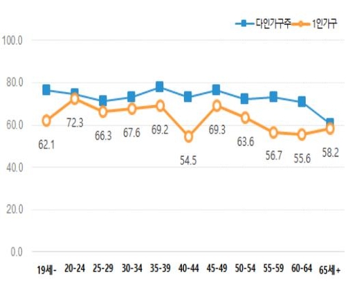 재정 상태 만족도, 사회생활 행복도, 건강 상태 만족도 등에서도 1인 가구는 40대부터 다인 가구주보다 낮은 수치를 기록했다.