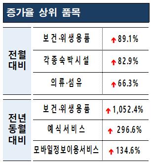 상담 상품별로 보면 보건·위생용품의 상담 증가율이 89.1%로 가장 높았고, 각종 숙박시설(82.9%), 의류·섬유(66.3%)가 그 뒤를 이었다.
