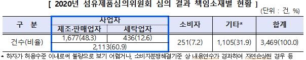 책임소재별로는 품질 하자 등 제조·판매업자 책임이 48.3%로 절반가량을 차지했다. 세탁업자 책임은 12.6%, 소비자 책임은 7.2%였다.