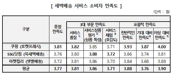 지난해 10월 15~20일 온라인으로 이뤄진 이 조사에서 쿠팡(로켓프레시)의 종합 만족도는 5점 만점에 3.81점으로 SSG닷컴(쓱 새벽배송) 3.76점, 마켓컬리(샛별배송) 3.72점보다 높았다.