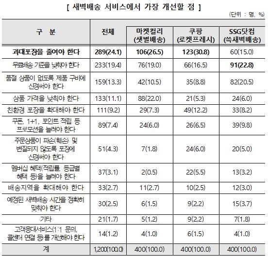 특히 쿠팡 이용자의 30.8%, 마켓컬리 이용자의 26.5%가 과대포장을 개선사항으로 꼽았다.