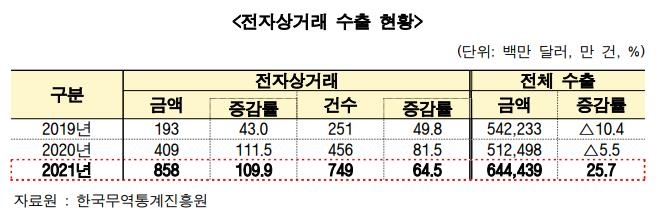 대한무역투자진흥공사(코트라) 무역투자연구센터는 6일 공개한 '2021년 우리나라의 전자상거래 수출 동향' 보고서에서 지난해 전자상거래 수출이 전년 대비 109.9% 증가한 8억5천800만달러를 기록했다고 밝혔다.