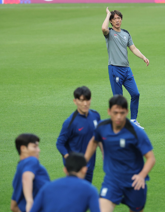 South Korea head coach Hong Myung-bo (rear) watches his players train at Seoul World Cup Stadium in Seoul on June 9, 2025, a day ahead of their one remaining match against Kuwait in the third round of Asian qualifying for the 2026 World Cup. (Yonhap)