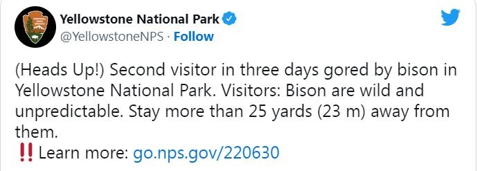 옐로스톤 국립공원 측은 관광객들에게 "공원 내 캠프장과 산책로 등에서 바이슨 포함 대형 동물을 보게 되면 최소 25야드(약 23m) 이상 거리를 두라"고 당부했다.