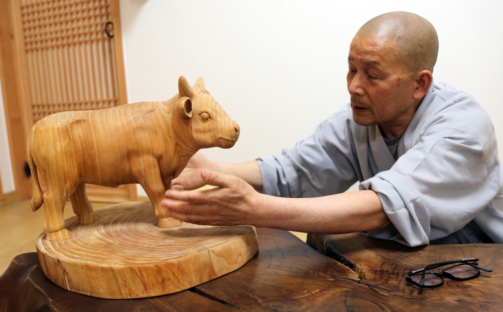 기자와 스님 사이에 놓인 탁자에는 어느 목수가 나무를 통째로 깎아서 만들었다는 소가 한 마리 놓여 있었다.