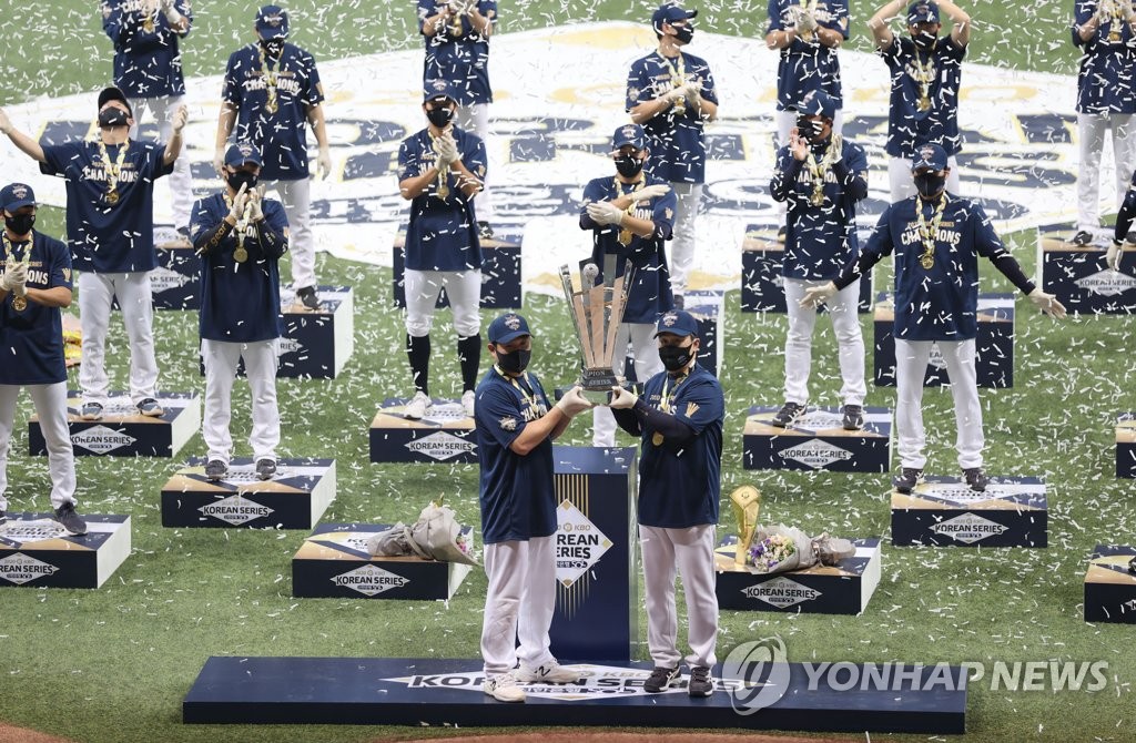 | ▲ 사회적 거리 두기로 떨어져 서 있는 NC 다이노스의 한국시리즈 우승 시상식 [연합뉴스 자료사진] |