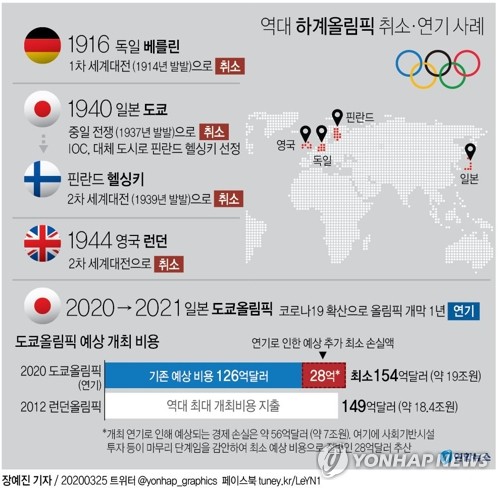 | ▲ [그래픽] 역대 하계올림픽 취소·연기 사례 (서울=연합뉴스) 장예진 기자 = 2021년으로 1년 미뤄진 도쿄올림픽이 역대 하계 올림픽 사상 가장 많은 돈을 들이는 대회가 될 전망이다. jin34@yna.co.kr |