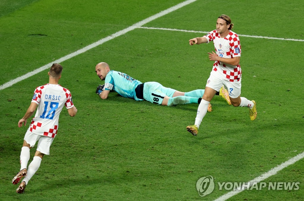 | ▲ 역전골 성공시키는 크로아티아 마르코 리바야 (도하=연합뉴스) 김도훈 기자 = 27일(현지시간) 카타르 도하의 칼리파 인터내셔널 스타디움에서 열린 2022 카타르 월드컵 조별리그 F조 크로아티아와 캐나다의 경기. 크로아티아 마르코 리바야가 역전 골을 성공시키고 있다. 2022.11.28 superdoo82@yna.co.kr |