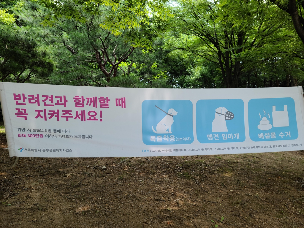 | ▲ 서울숲에 걸린 반려견 산책 주의사항 현수막 (서울=연합뉴스) 송정은 기자 = 서울숲 |