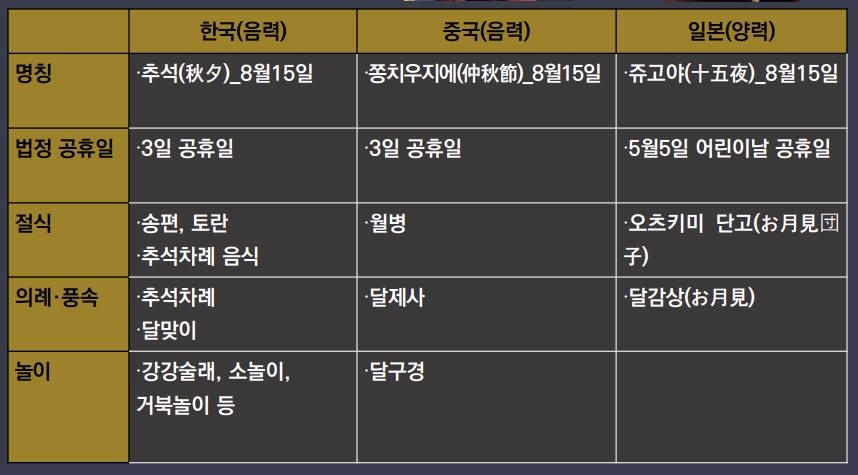 | ▲ 한·중·일 명절 비교 한국민속학회가 '명절 분야 국가무형문화재 지정가치 조사 연구'를 진행하며 정리한 한·중·일의 음력 8월 15일 특징 [문화재청·한국민속학회 제공. 재판매 및 DB 금지] |