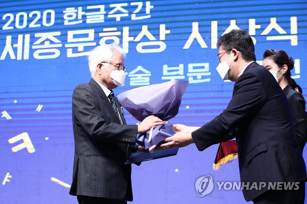 | ▲ 2020 한글주간 세중문화상 시상식 모습 지난 2020년 열린 세종문화상 시상식에서 김광언 인하대학교 사회교육과 명예교수(왼쪽)이 대통령 표창을 받는 모습 [연합뉴스 자료사진] |