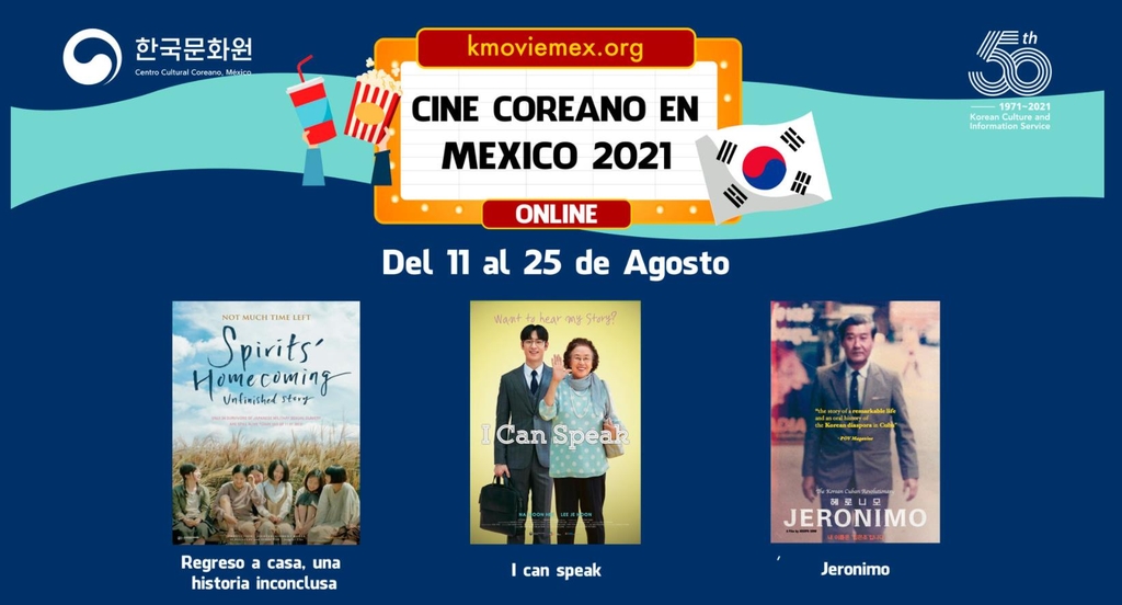 11일부터 25일까지 '온라인 한국영화관'(kmoviemex.org)에서 선보이는 영화는 위안부 이야기를 다룬 영화 '귀향, 끝나지 않은 이야기'와 '아이 캔 스피크', 100년 전 멕시코에서 쿠바로 재이주한 한인들을 조명한 다큐멘터리 '헤로니모'다.