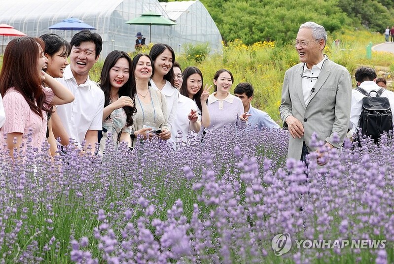 | ▲ 동해 라벤더정원 찾은 유인촌 장관 (동해=연합뉴스) 양지웅 기자 = 7일 강원 동해시 무릉별유천지 내 라벤더정원을 찾은 유인촌 문화체육관광부 장관이 청년 직원 및 명예기자단과 대화하고 있다. 유 장관은 지역 관광을 활성화하고자 전국 관광명소 100곳을 소개하는 프로그램인 '로컬100' 현장을 순회하는 '로컬100 보러 로컬로' 캠페인을 펼치고 있다. 2024.6.7 yangdoo@yna.co.kr |