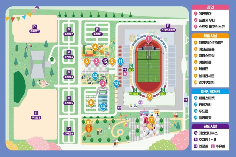 행사장 곳곳에는 먹거리 부스와 푸드트럭, 카페, 농산물 직거래장터, 플리마켓이 설치된다.