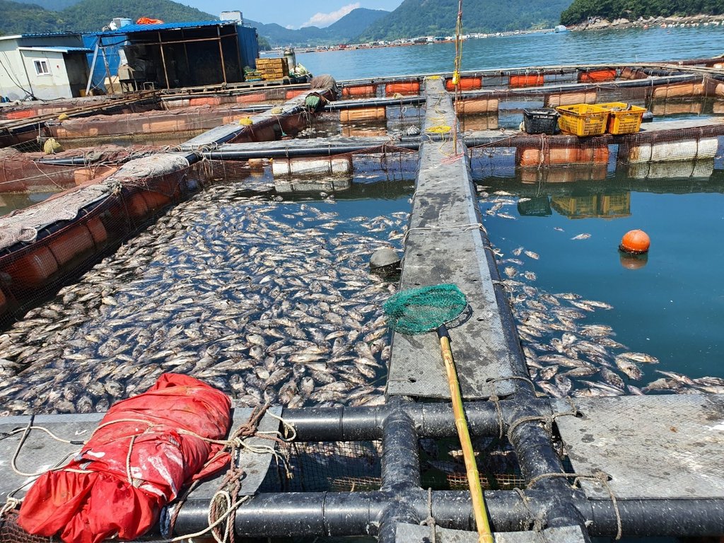 ▲ 폭염에 폐사한 우럭 (여수=연합뉴스) 지난해 8월 폭염에 폐사한 우럭. 2021.8.9 [더불어민주당 주철현 의원실 제공. 재판매 및 DB 금지] photo@yna.co.kr