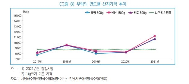 이처럼 생산량이 줄면서 지난해 우럭 가격은 큰 폭으로 상승했다. 작년 우럭의 산지 가격은 ㎏당 평균 1만1천907원으로 전년 대비 45.8% 올랐다. 평년에 비해서도 37.2% 높은 수준이다.