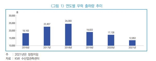 우럭 출하량은 2016년 1만8천163t에서 2017년 2만2천457t, 2018년 2만4천393t까지 늘어난 뒤 2019년 1만9천22t, 2020년 1만7천128t 등으로 꾸준히 감소하는 추세다. 지난해에는 1만2천953t까지 줄면서 최근 6년 간 최저치를 기록했다.