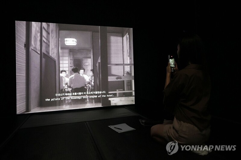 바람이 부는 어두컴컴한 전시장에 마치 료칸의 다다미방처럼 꾸며진 각 공간에서 상영되는 것은 2차대전 당시 선전 영화 제작 등을 위해 징집됐던 유명 영화감독 오즈 야스지로의 1949년작 '만춘'과 '후쿠짱' 만화로 유명한 요코야마 류이치가 1944년 만든 선전 만화 영화, 기록 영화 등을 작가가 선택해 편집한 영상이다.