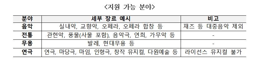 | ▲ '지역대표예술단체 지원사업 공모' 지원 가능 분야 [문화체육관광부 제공. 재판매 및 DB 금지] |