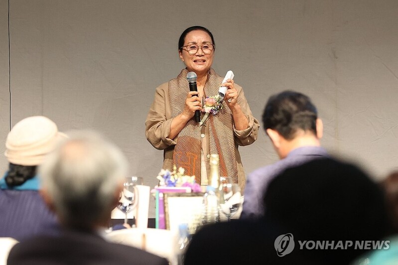 | ▲ 최고령 현역 김매자 무용가 (서울=연합뉴스) 강민지 기자 = 현역 최고령 무용가인 김매자 창무예술원 이사장이 28일 오후 서울 마포구 포스트극장에서 열린 '세계 무용사'출판 기념식에서 인사말을 하고 있다. 2024.5.28 mjkang@yna.co.kr |
